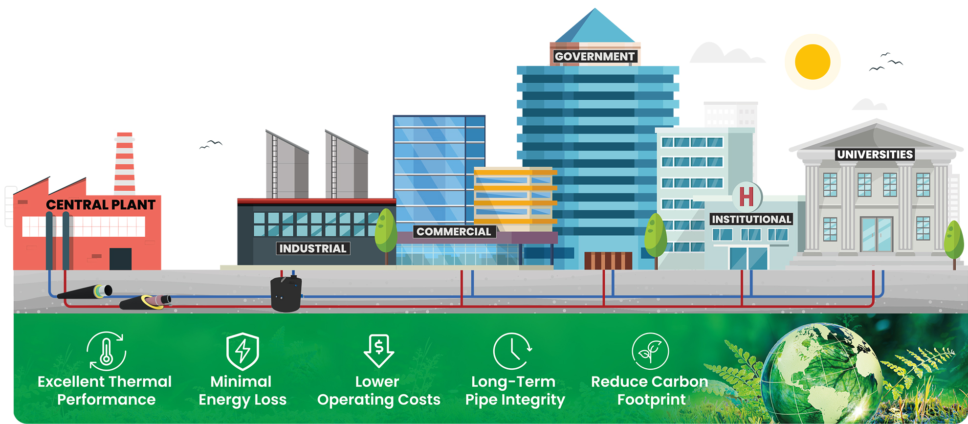 Steam, hot and chilled water is the standard medium used in these piping systems to transfer energy from its source to consumers and pre-insulated piping systems are the key to efficiently bringing this energy where it is needed.